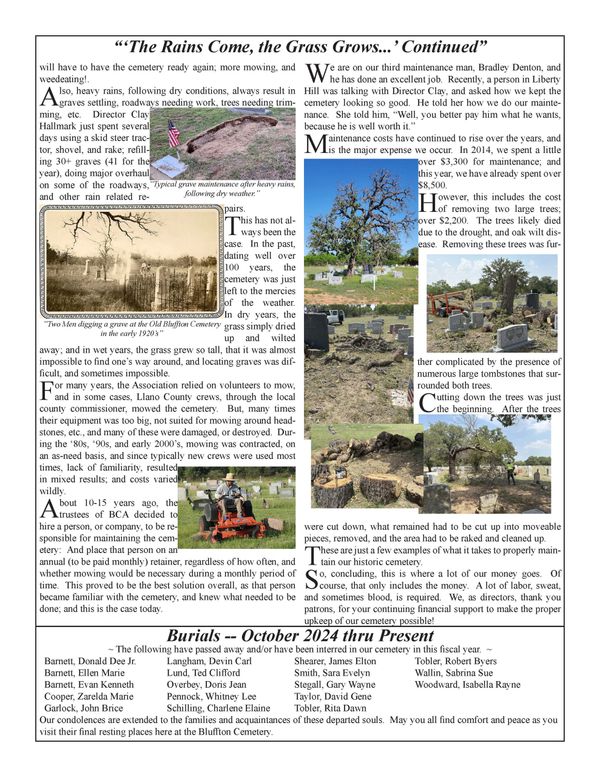 You, the patrons, are the most important link in the continued success of the Bluffton Cemetery. The association's only source of revenue is through your donations. Thank you for the support that has made the Bluffton Cemetery the success it is today.