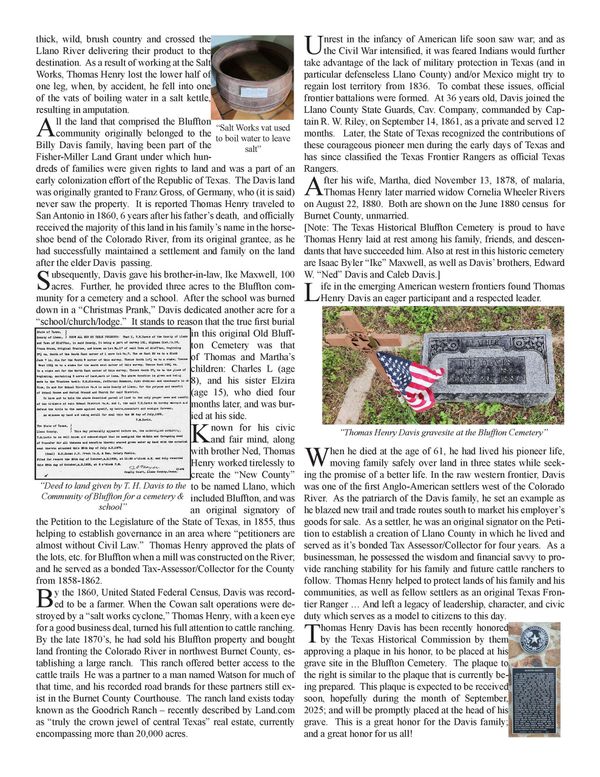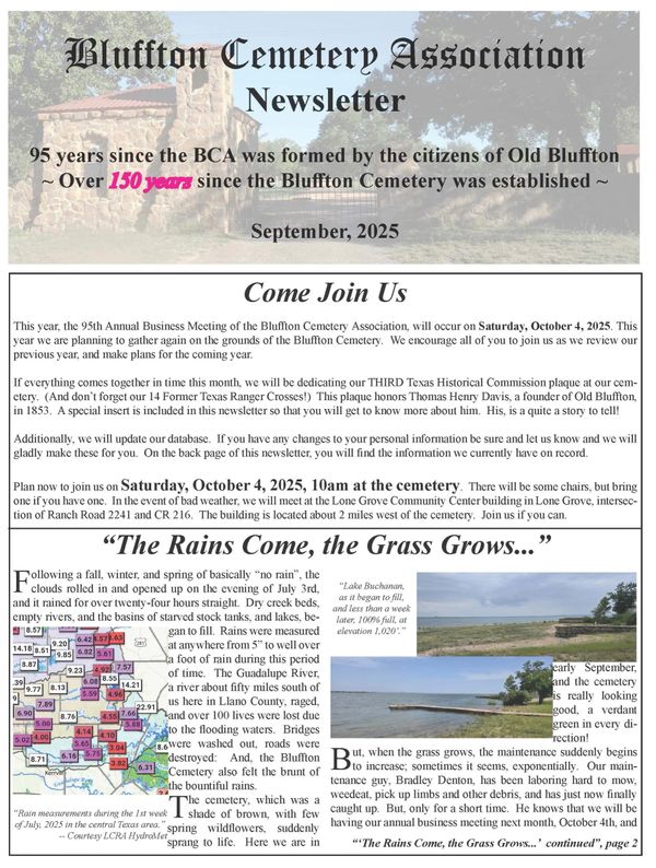 The Bluffton Cemetery is a historic cemetery that dates back over 150 years, to about 1864. In 2001, the Texas Historical Commission designated the Bluffton Cemetery as a Historic Texas Cemetery. The plaque to the left is proudly mounted on the wall of the chapel facing Ranch Road 2241.