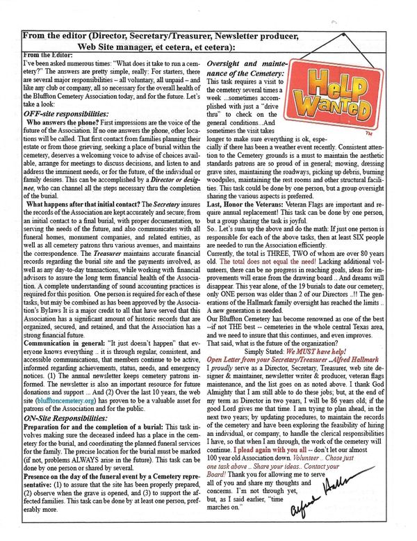 The trustees (directors) are subject to the current Bluffton Cemetery Bylaws. The primary duties of the trustees include keeping the records of the cemetery, handling the finances of the cemetery, maintaining the cemetery, and planning for the future of the cemetery.