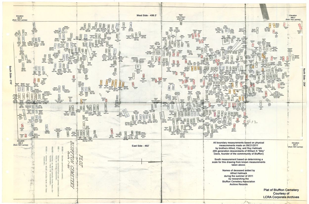 Old Bluffton Cemetery Plat - With names of deceased added by Alfred Hallmark during the summer of 2011, by researching BCA records.