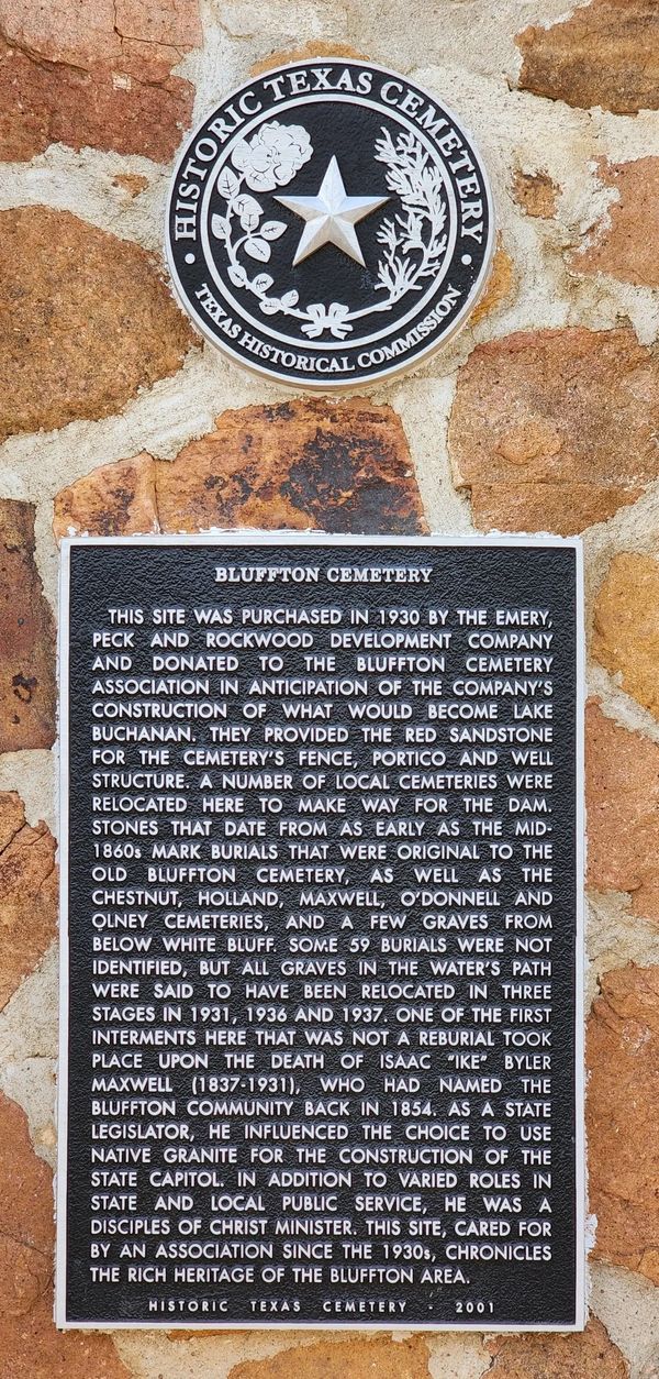 This cemetery is actually the second Bluffton Cemetery. The first, the Old Bluffton Cemetery, was covered by the waters of Lake Buchanan in 1937; and this cemetery, the New Bluffton Cemetery was built in 1931 to replace the Old Bluffton Cemetery. Of the 459 graves that were moved from the basin of Lake Buchanan, 422 were moved to the New Bluffton Cemetery, now commonly called the Bluffton Cemetery. Today, there are approximately 1,500 persons buried here.
