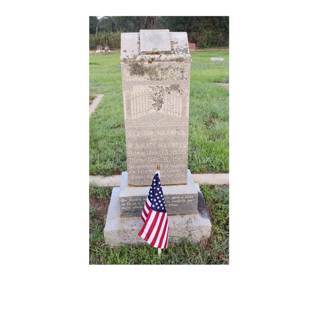Young Claudie Maxwell, barely 22 years of age, entered the army at the beginning of the USA's entrance intoWorld War I. Unfortunately, he died from the Spanish Flu pandemic while stationed in Camp Bowie, Fort Worth, Texas; before being sent to the European theatre of war. More men died of the pandemic than died in combat during the war.
